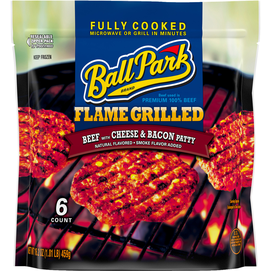 Ball Park Flame Grilled Beef Cheese & Bacon 6 Each 16.2 0z "Per One Burger: 270 Calories, 22g Total Fat, 75mg Cholesterol, 550mg Sodium, 0g Total Carbohydrate, 17g Protein" ![]() |