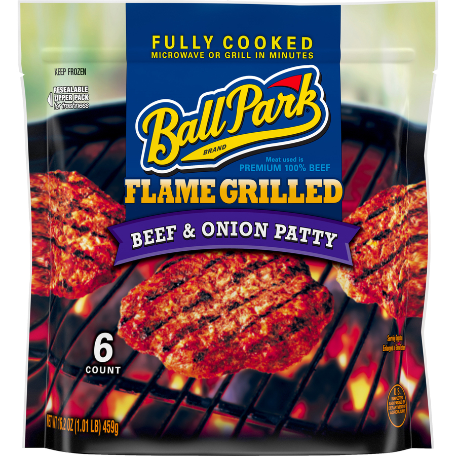 Ball Park Flame Grilled Beef Patty 6 Each 16.2 Oz "Per One Burger: 210 Calories, 18g Total Fat, 65mg Cholesterol, 390mg Sodium, 0g Total Carbohydrate, 13g Protein" ![]() |