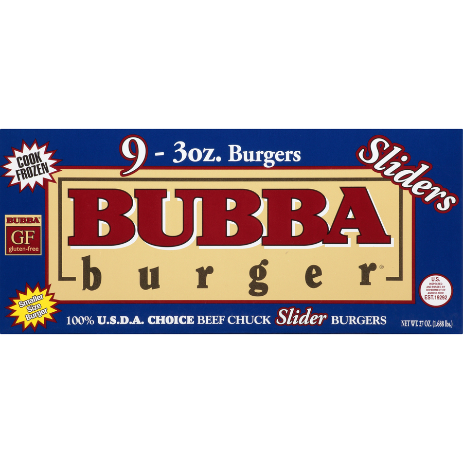 Bubba Burger Beef Chuck Sliders 9 Each 27 Oz "Per One Burger: 230 Calories, 19g Total Fat, 55mg Cholesterol, 50mg Sodium, 0g Total Carbohydrate, 15g Protein" ![]() |