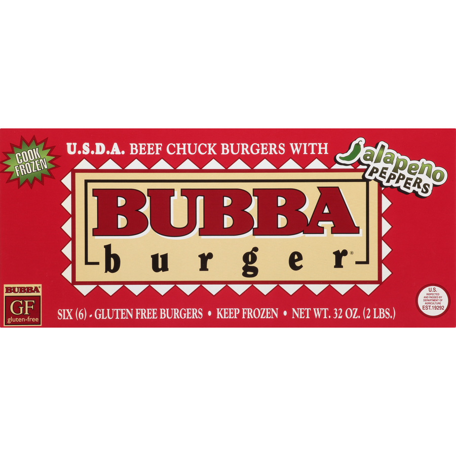 Bubba Burger Beef Chuck With Jalapeño Peppers 6 Each 32 Oz "Per One Burger: 340 Calories, 29g Total Fat, 85mg Cholesterol, 95mg Sodium, 0g Total Carbohydrate, 20g Protein" ![]() |