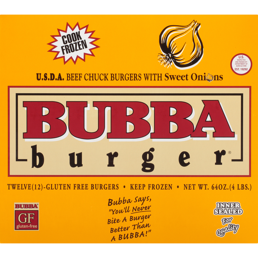 Bubba Beef Chuck & Sweet Onions 12 Each 64 Oz "Per One Burger: 340 Calories, 26g Total Fat, 90mg Cholesterol, 80mg Sodium, 2g Total Carbohydrate, 23g Protein" ![]() |