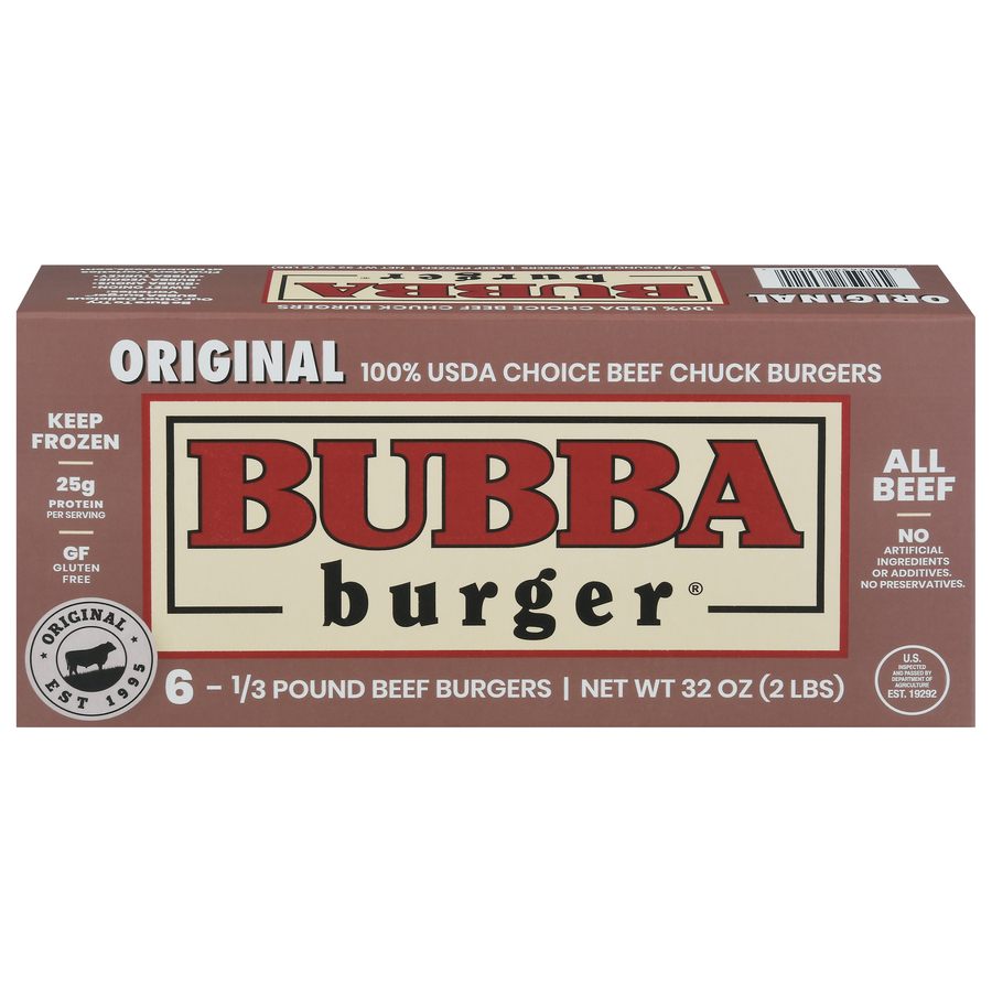 Bubba Burger Original Beef Chuck Burgers 6 Each 32 Oz "Per One Burger: 420 Calories, 35g Total Fat, 110mg Cholesterol, 85mg Sodium, 0g Total Carbohydrate, 25g Protein" ![]() |