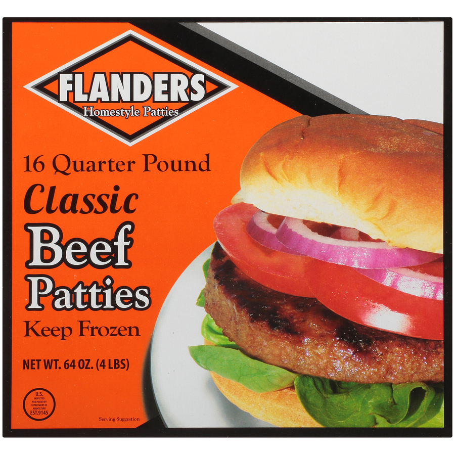 Flanders 1/4 LB Classic Beef Patties 16 Each 64 Oz "Per One Patty: 340 Calories, 28g Total Fat, 60mg Cholesterol, 720mg Sodium, 6g Total Carbohydrate, 17g Protein" ![]() |