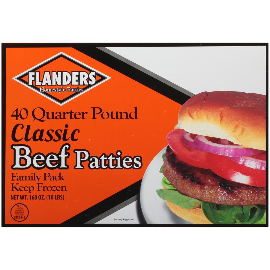 Flanders 1/4 LB Classic Beef Patties 40 Each 160 Oz "Per One Patty: 340 Calories, 28g Total Fat, 60mg Cholesterol, 720mg Sodium, 6g Total Carbohydrate, 17g Protein" ![]() |