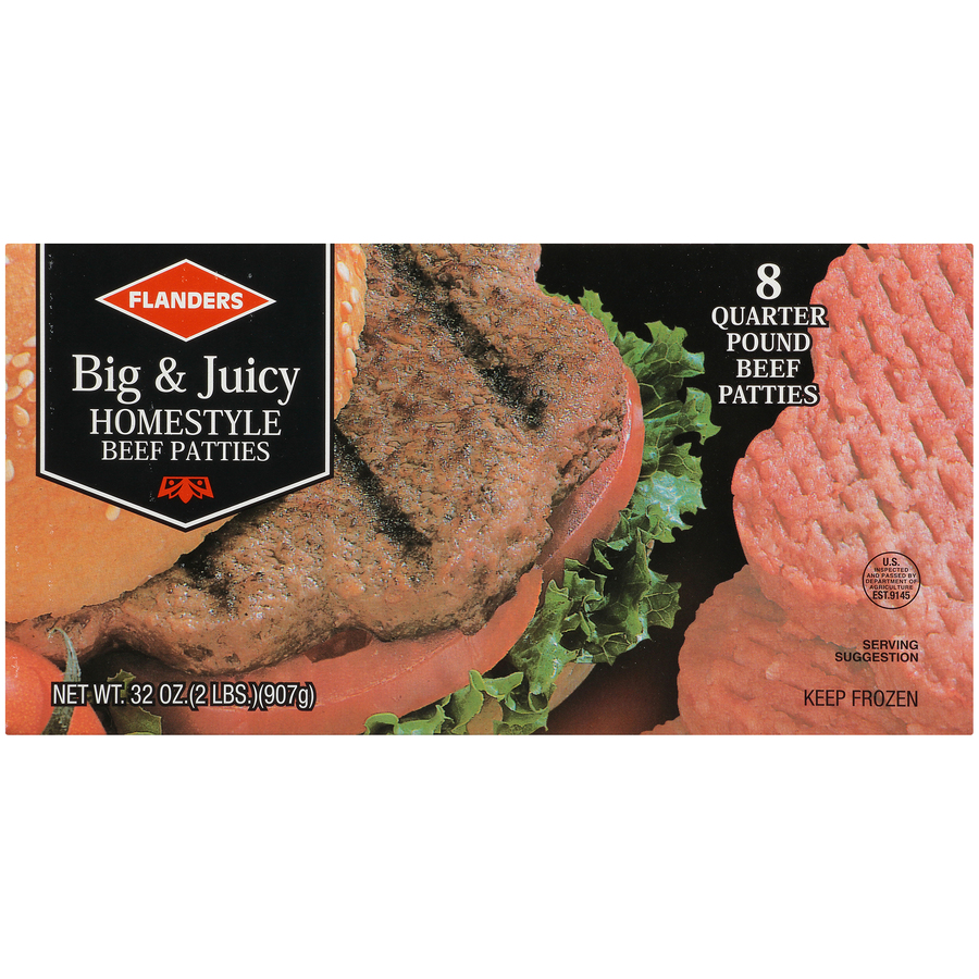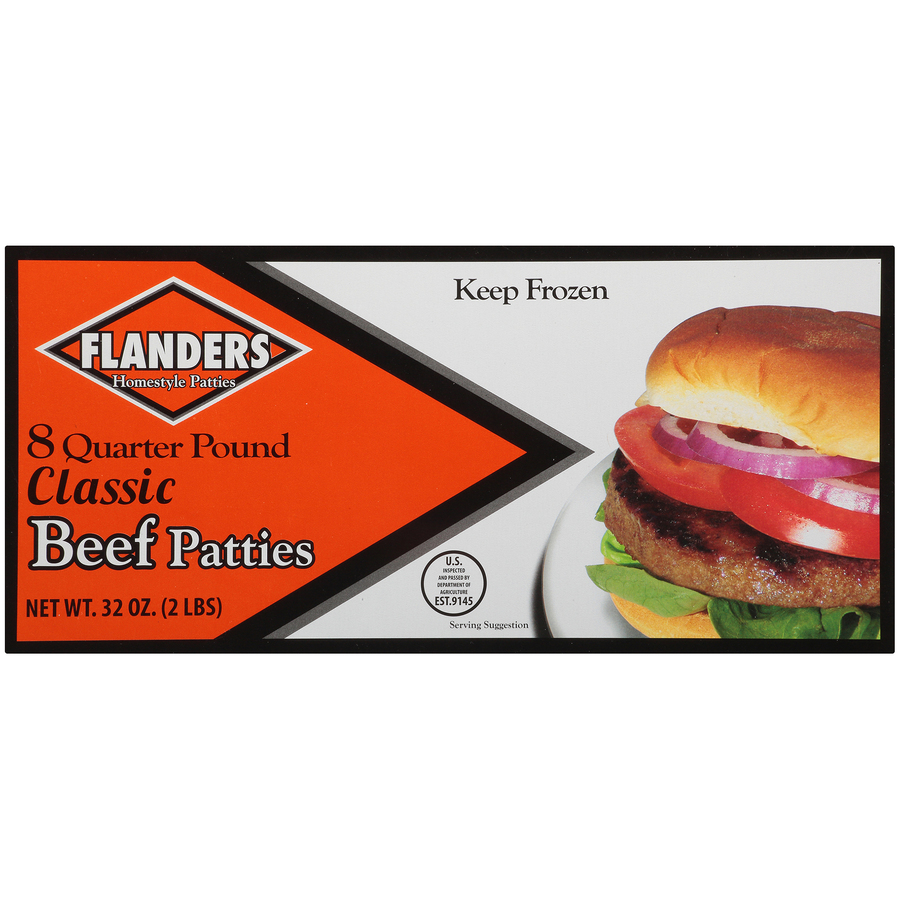 Flanders 1/4 Pound Classic Beef Patties 8 Each 32 Oz "Per One Patty: 340 Calories, 28g Total Fat, 60mg Cholesterol, 720mg Sodium, 6g Total Carbohydrate, 17g Protein" ![]() |