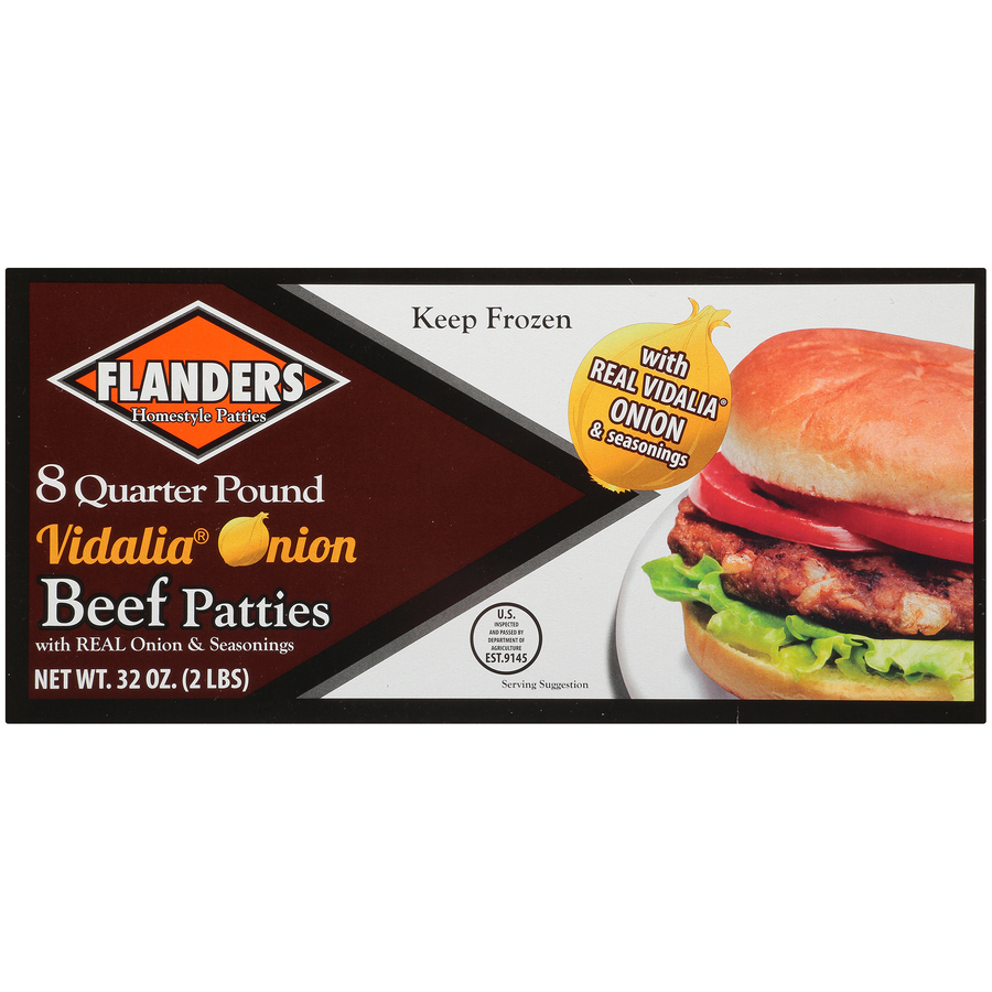 Flanders 1/4 LB Vidalia® Onion Beef Patties 16 Each 64 Oz "Per One Patty: 290 Calories, 24g Total Fat, 50mg Cholesterol, 800mg Sodium, 7g Total Carbohydrate, 15g Protein" ![]() |