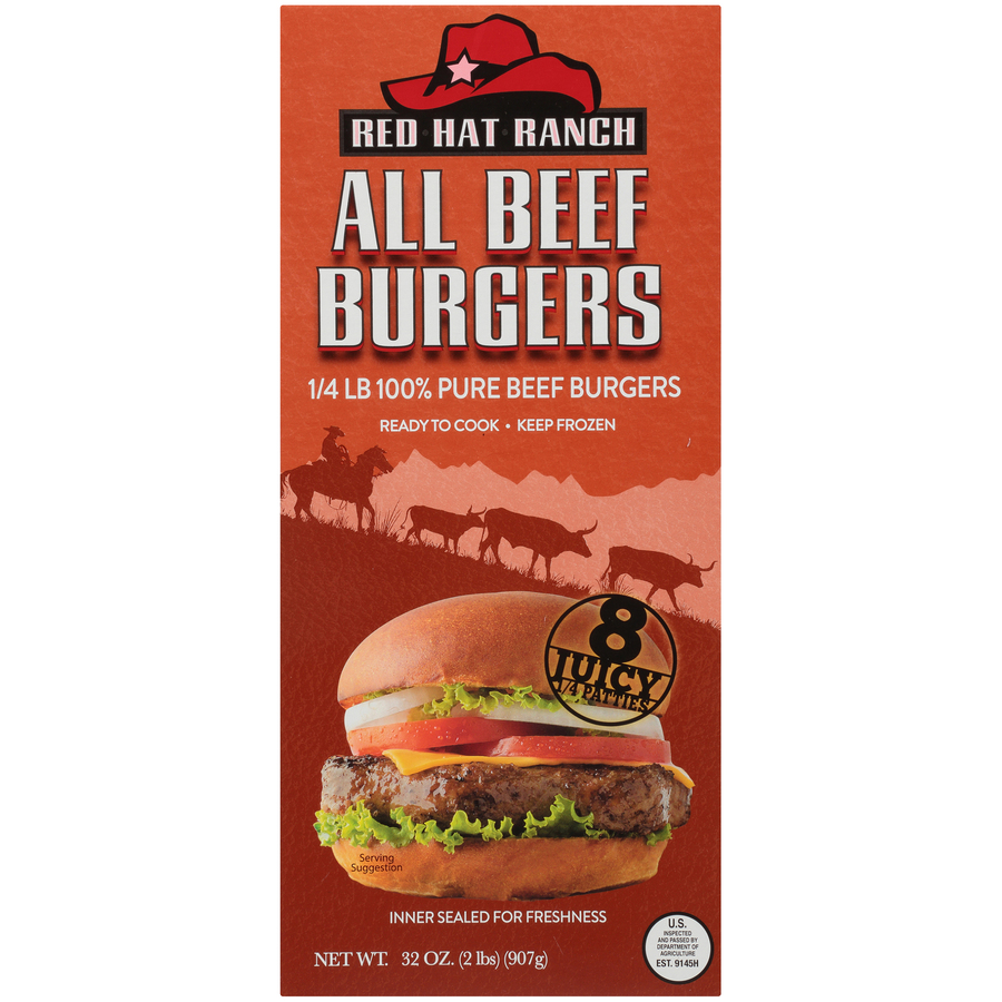 Red Hat Ranch All Beef Burgers 8 Each 32 Oz "Per One Burger: 320 Calories, 27g Total Fat, 55mg Cholesterol, 70mg Sodium, 2g Total Carbohydrate, 17g Protein" ![]() |
