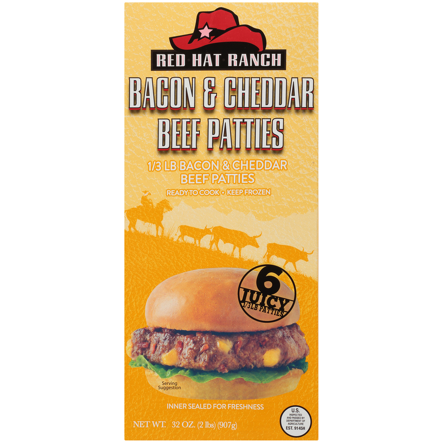 Red Hat Ranch Bacon & Cheddar Beef Patties 6 Each 32 Oz "Per One Burger: 450 Calories, 39g Total Fat, 65mg Cholesterol, 510mg Sodium, 0g Total Carbohydrate, 26g Protein" ![]() |