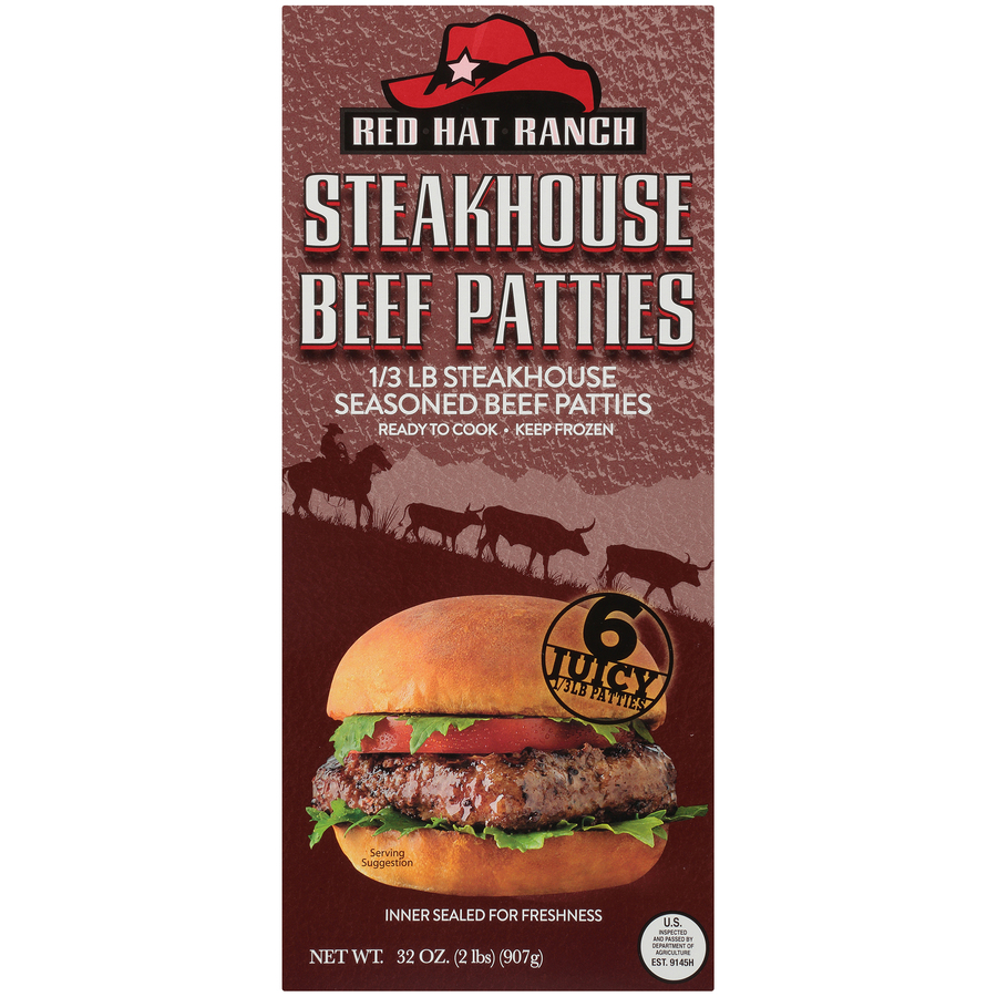 Red Hat Ranch Steakhouse Seasoned Beef Patties 6 Each 32 Oz "Per One Burger: 360 Calories, 31g Total Fat, 75mg Cholesterol, 630mg Sodium, 0g Total Carbohydrate, 22g Protein" ![]() |