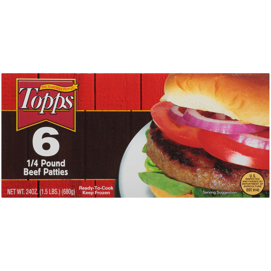 Topps 1/4 Pound Beef Patties 6 Each 24 Oz "Per One Patty: 280 Calories, 22g Total Fat, 45mg Cholesterol, 590mg Sodium, 6g Total Carbohydrate, 14g Protein" ![]() |