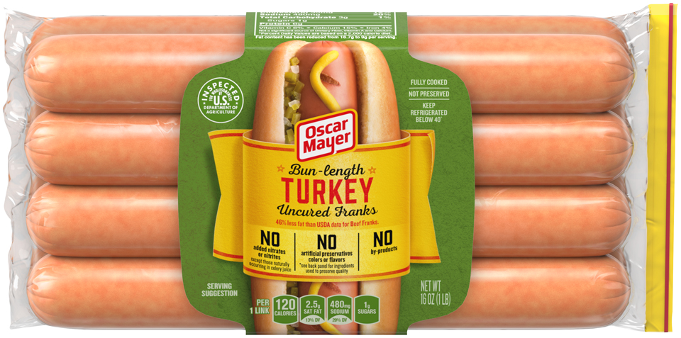 Oscar Mayer Bun Length Turkey Uncured Franks 16 Oz "Per One Link: 120 Calories, 2.5g Sat Fat, 480mg Sodium, 1g Sugars" ![]() |