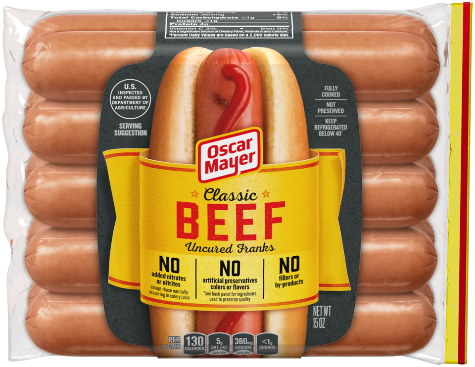 Oscar Mayer Classic Beef Uncured Franks 15 Oz "Per One Link: 130 Calories, 5g Sat Fat, 360mg Sodium, <1g Sugars" ![]() |