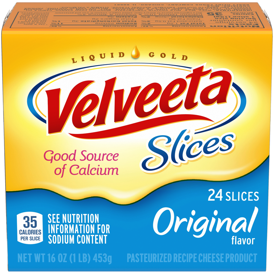 Velveeta Original Slices 16 Oz "Per One Slice: 35 Calories, 0.5g Sat Fat, <5mg Cholesterol, 250mg Sodium, 3g Protein" ![]() |