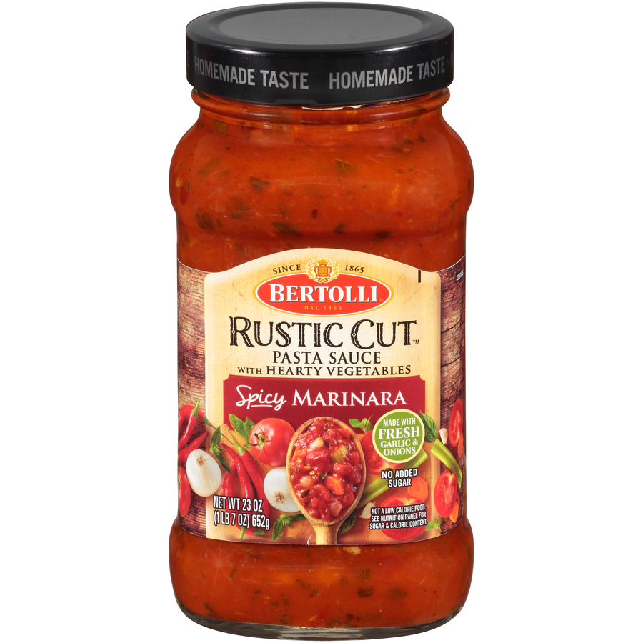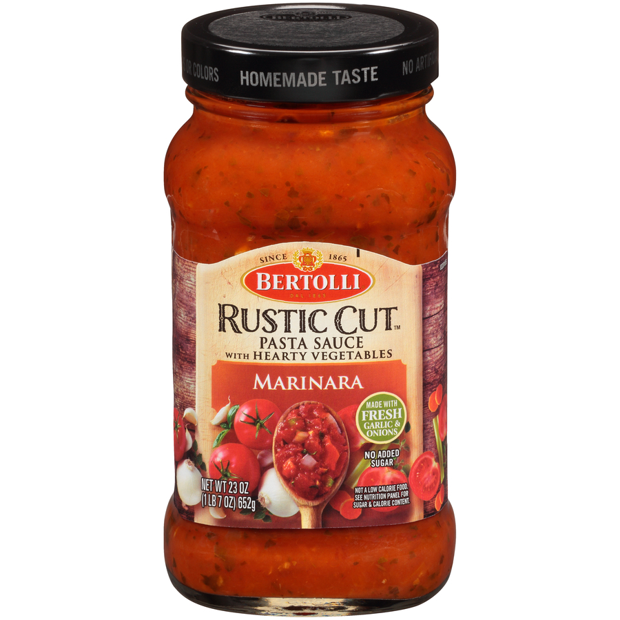 Rustic Cut Marinara With Hearty Vegetables, Fresh Garlic & Onions 23 Oz "Per 1/2 Cup Serving: 100 Calories, 6g Total Fat, 0mg Cholesterol, 480mg Sodium, 8g Total Carb, 2g Protein" |