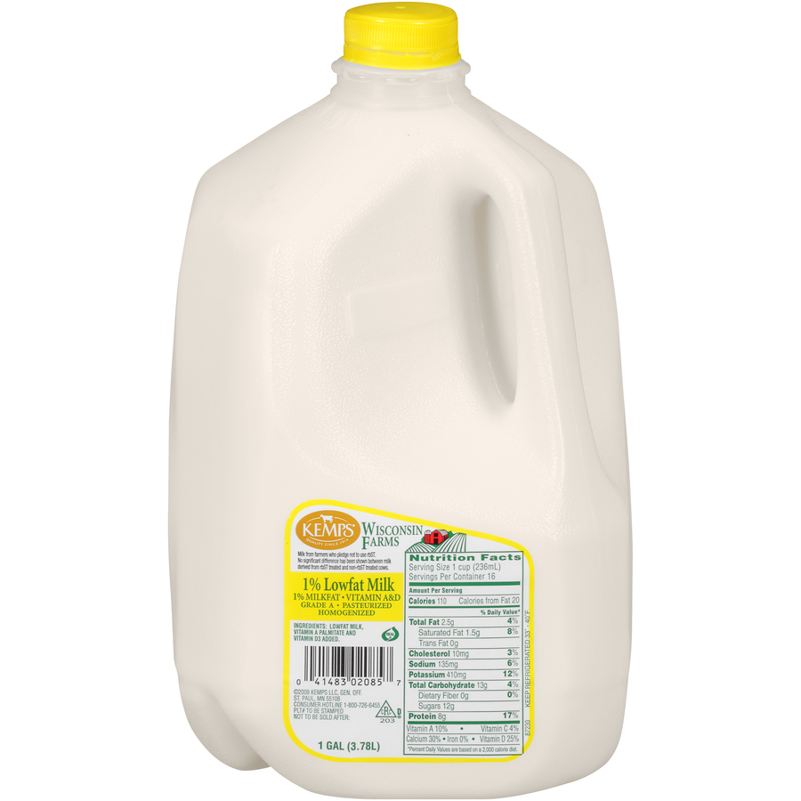1% Low Fat Milk With Vitamin A And D, 1 Gallon "Per One Cup: 110 Calories, 2.5g Total Fat, 10mg Cholesterol, 135mg Sodium, 410mg Potassium, 13g Total Carbohydrate, 8g Protein" ![]() |