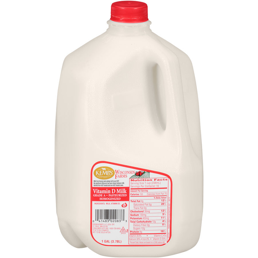 Kemps Select Vitamin D Whole Milk, One Gallon "Per One Cup: 150 Calories, 8g Total Fat, 35mg Cholesterol, 125mg Sodium, 12g Total Sugars, 12g Carbohydrate, 8g Protein" ![]() |