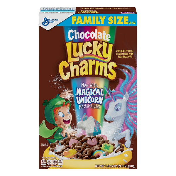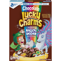 Chocolate Lucky Charms With Magical Unicorn Marshmallows 12 Oz "Chocolatey Whole Grain Cereal With Marshmallows. Per 3/4 Cup Serving: 100 Calories, 0g Sat Fat, 150mg Sodium, 10g Sugars." ![]() |