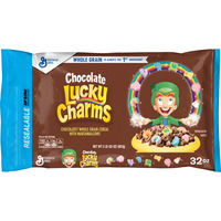 Chocolate Whole Grain Lucky Charms, Resealable 2 LB "Chocolatey Whole Grain Cereal With Marshmallows. Per 3/4 Cup Serving: 110 Calories, 0g Sat Fat, 150mg Sodium, 10g Sugars." ![]() |