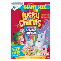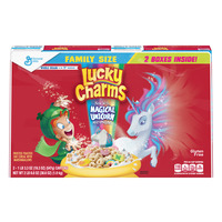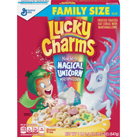 Family Size Lucky Charms With Magical Unicorn Marshmallows 1 LB 3.3 Oz "Frosted Toasted Oat Cereal With Marshmallows. Gluten Free. Per 3/4 Cup Serving: 110 Calories, 0g Sat Fat, 170mg Sodium, 10g Sugars." ![]() |