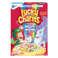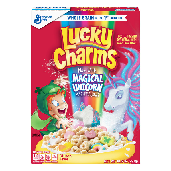 Lucky Charms With Magical Unicorn Marshmallows 10.5 Oz "Frosted Toasted Oat Cereal With Marshmallows. Gluten Free. Per 3/4 Cup Serving: 110 Calories, 0g Sat Fat, 170mg Sodium, 10g Sugars." ![]() |