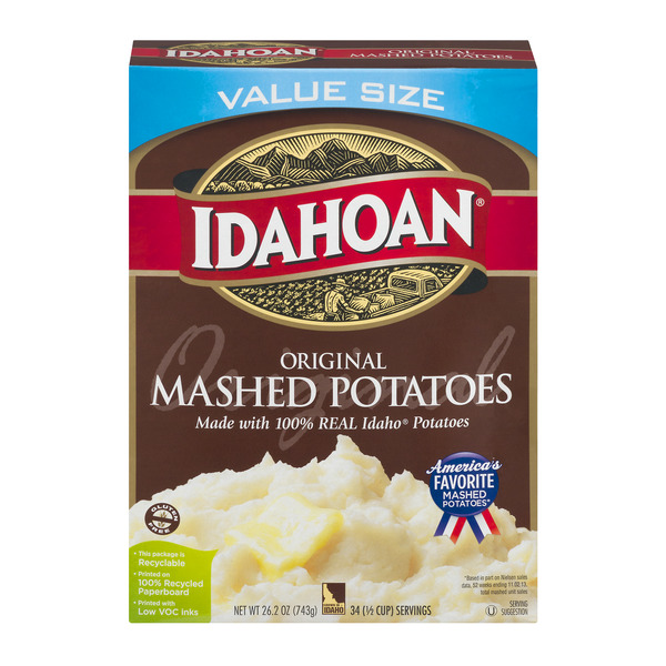 Idahoan Original Mashed Potatoes 13.75 Oz "1/2 Cup: 150 Calories, 7g Total Fat, 20mg Cholesterol, 370mg Sodium, 19g Total Carb, 3g Protein" ![]() |