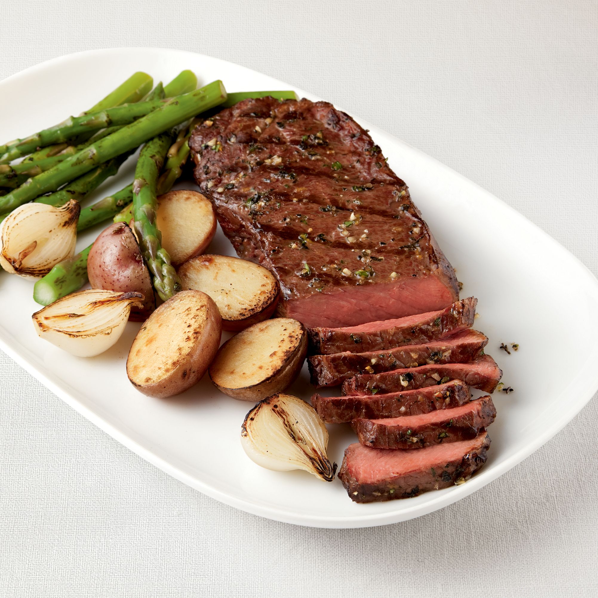 Place steaks on grid over medium, ash-covered coals; arrange potatoes, onions and asparagus around steaks. Grill steaks, covered, 11 to 14 minutes (over medium heat on preheated gas grill, 11 to 15 minutes) for medium rare (145°F) to medium (160°F) doneness, turning occasionally. Grill potatoes and onions 5 to 10 minutes (gas grill times remain the same) or until golden brown and tender; grill asparagus 6 to 10 minutes (covered, 8 to 12 minutes on gas grill) or until crisp-tender, turning occasionally.