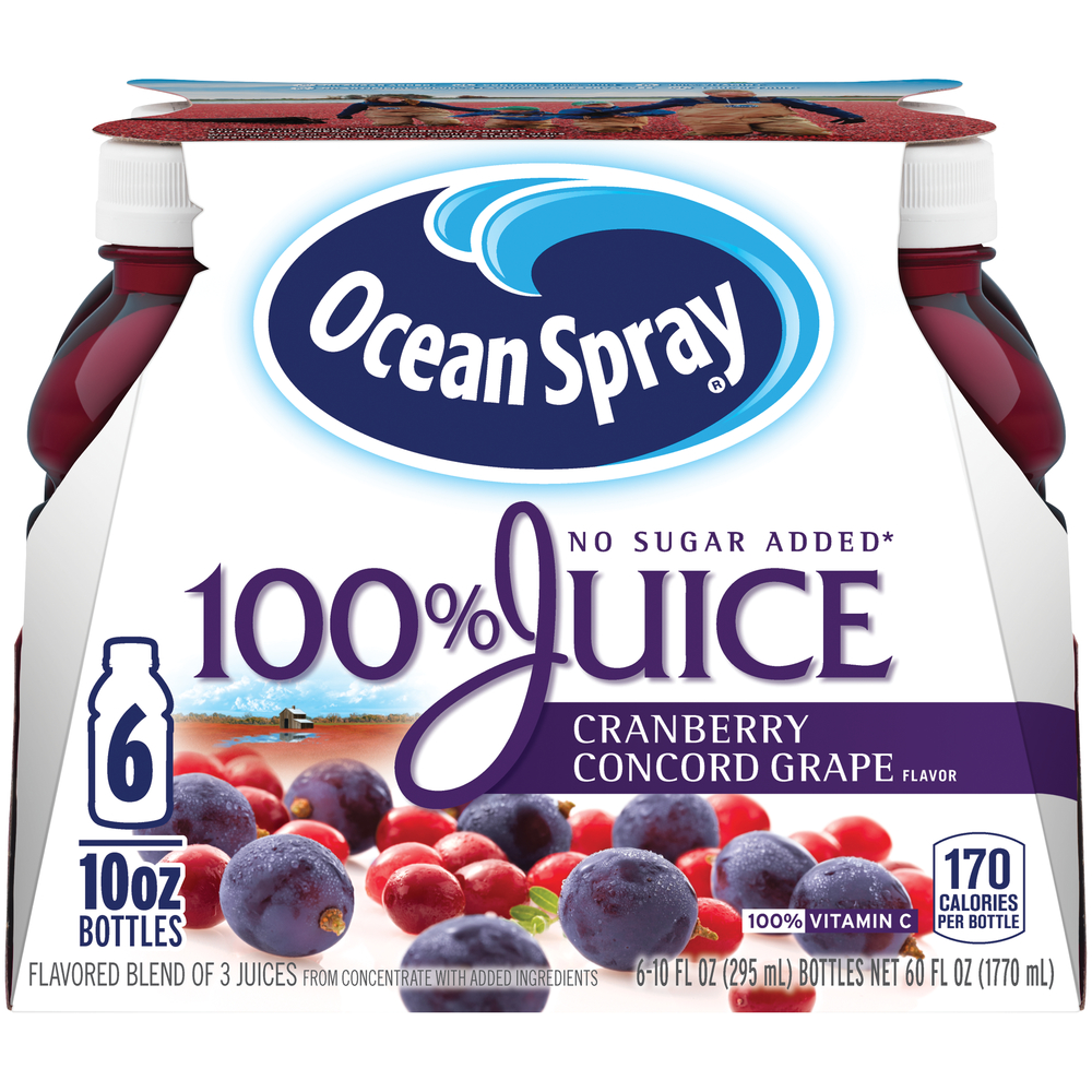100% Juice Cranberry Concord Grape Six 10 FL Oz Bottles "Per One Bottle: 170 Calories, 0g Total Fat, 25mg Sodium, 45g Total Carbohydrate, 0g Protein" ![]() |