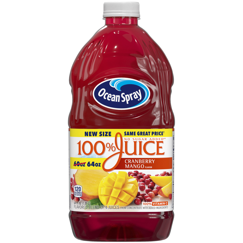 100% Juice Cranberry Mango 64 FL Oz "Per One Cup Serving: 120 Calories, 0g Total Fat, 20mg Sodium, 31g Total Carbohydrate, 0g Protein" ![]() |