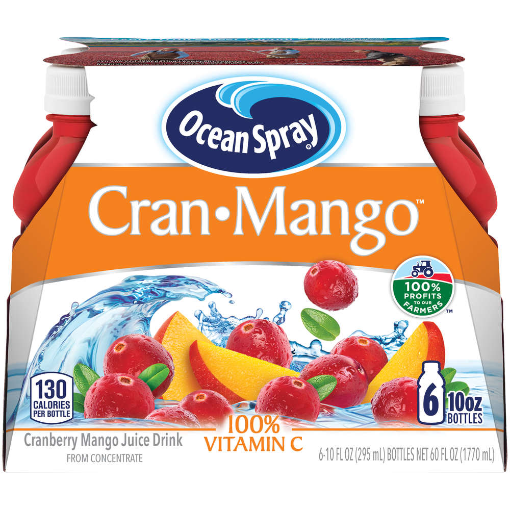 Ocean Spray Cran Mango Juice Drink Six 10 FL Oz Bottles "Per One Bottle: 130 Calories, 0g Total Fat, 30mg Sodium, 35g Total Carbohydrate, 0g Protein" ![]() |