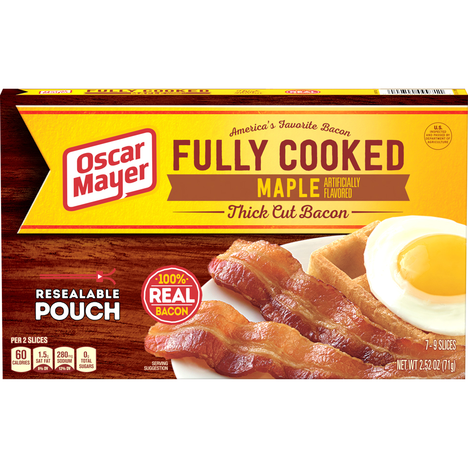 Fully Cooked Maple Thick Cut Bacon 2.52 Oz "Two Slices: 60 Calories, 4g Total Fat, 15mg Cholesterol, 280mg Sodium, 0g Total Carb, 6g Protein" ![]() |
