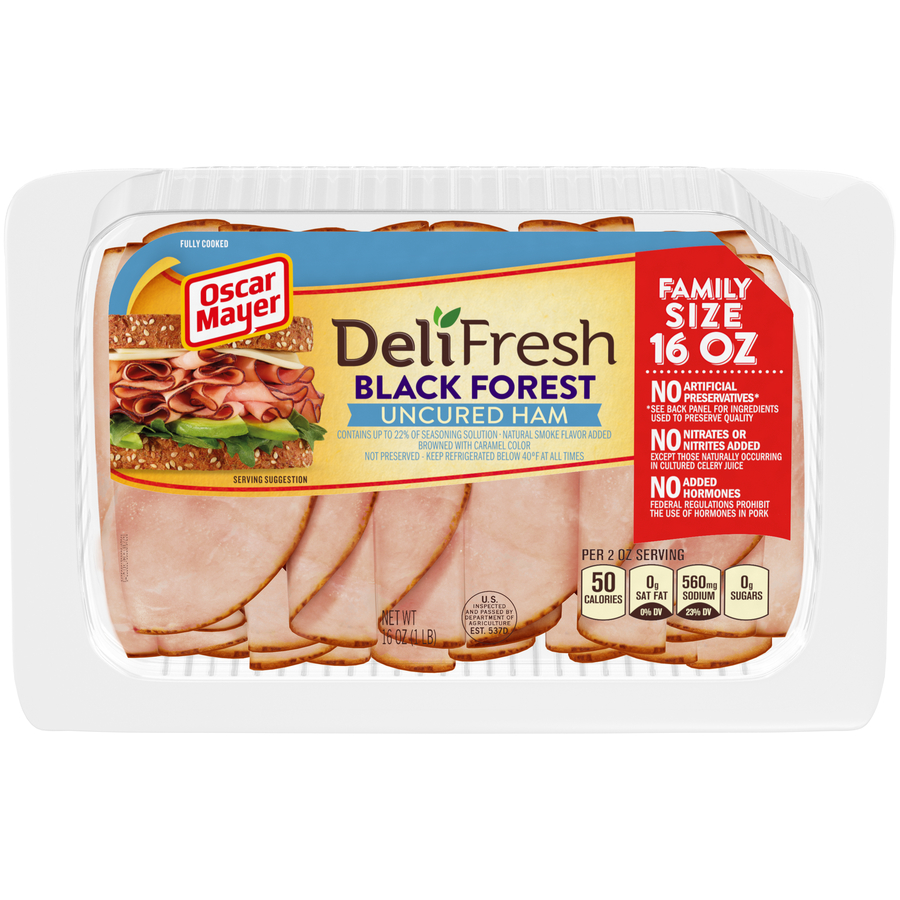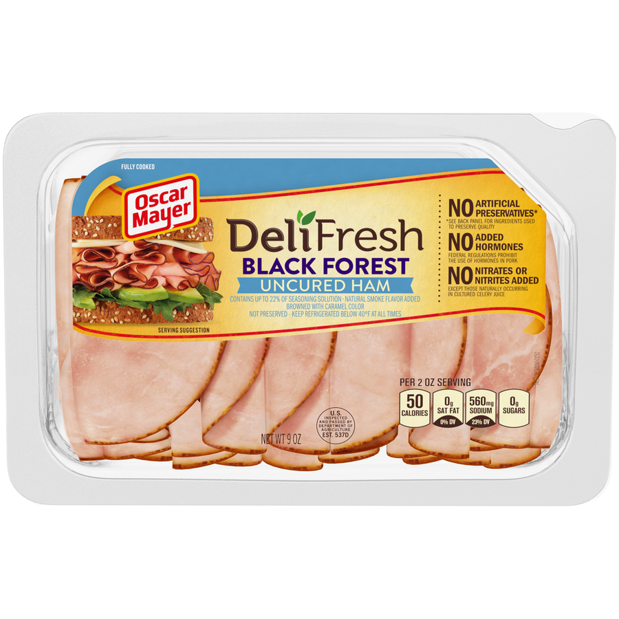 Deli Fresh Black Forest Uncured Ham 9 Oz "Per 2 Ounces: 50 Calories, 1.5g Total Fat, 30mg Cholesterol, 560mg Sodium, 0g Total Carb, 9g Protein" ![]() |