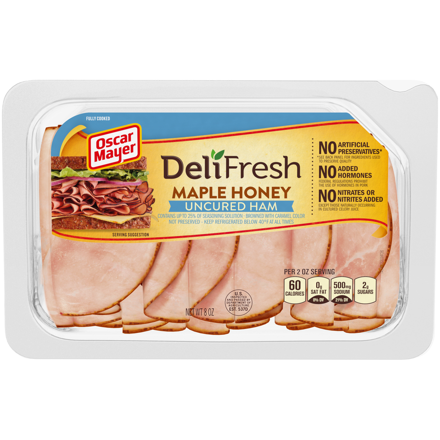 Deli Fresh Maple Honey Uncured Ham 8 Oz "Per 2 Ounces: 60 Calories, 1.5g Total Fat, 25mg Cholesterol, 500mg Sodium, 3g Total Carb, 9g Protein" ![]() |