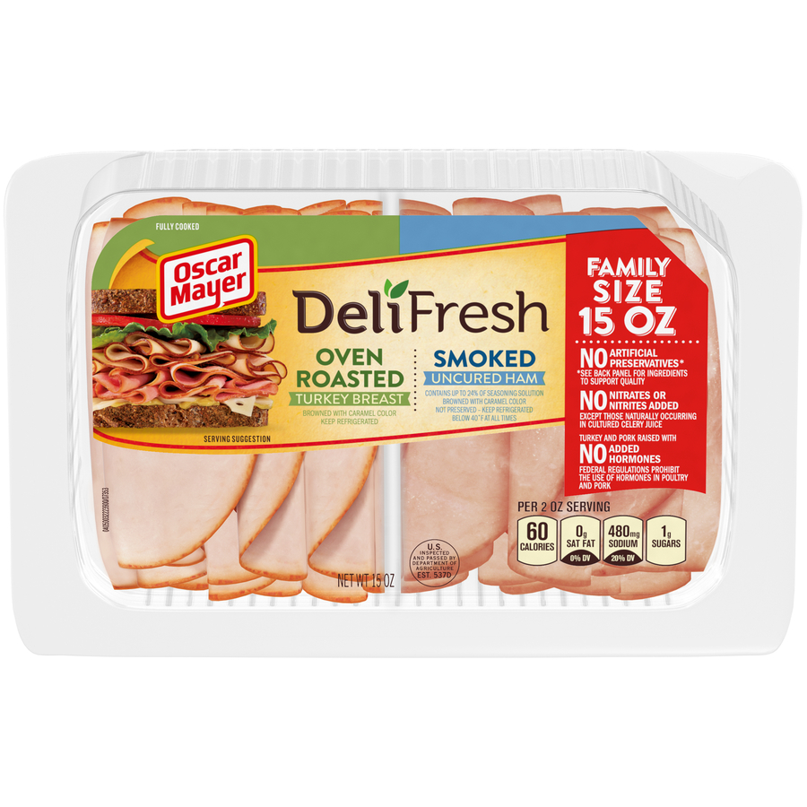 Oven Roasted Turkey & Honey Ham, Family Size 15 Oz "Per 2 Ounces: 60 Calories, 1g Total Fat, 25mg Cholesterol, 480mg Sodium, 2g Total Carb, 11g Protein" ![]() |