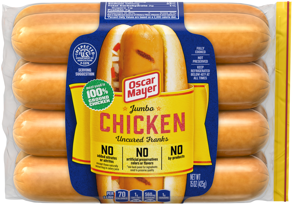 Jumbo Chicken Uncured Franks 15 Oz "Per One Link: 70 Calories, 4g Total Fat, 30mg Cholesterol, 560mg Sodium, 2g Total Carb, 7g Protein" ![]() |