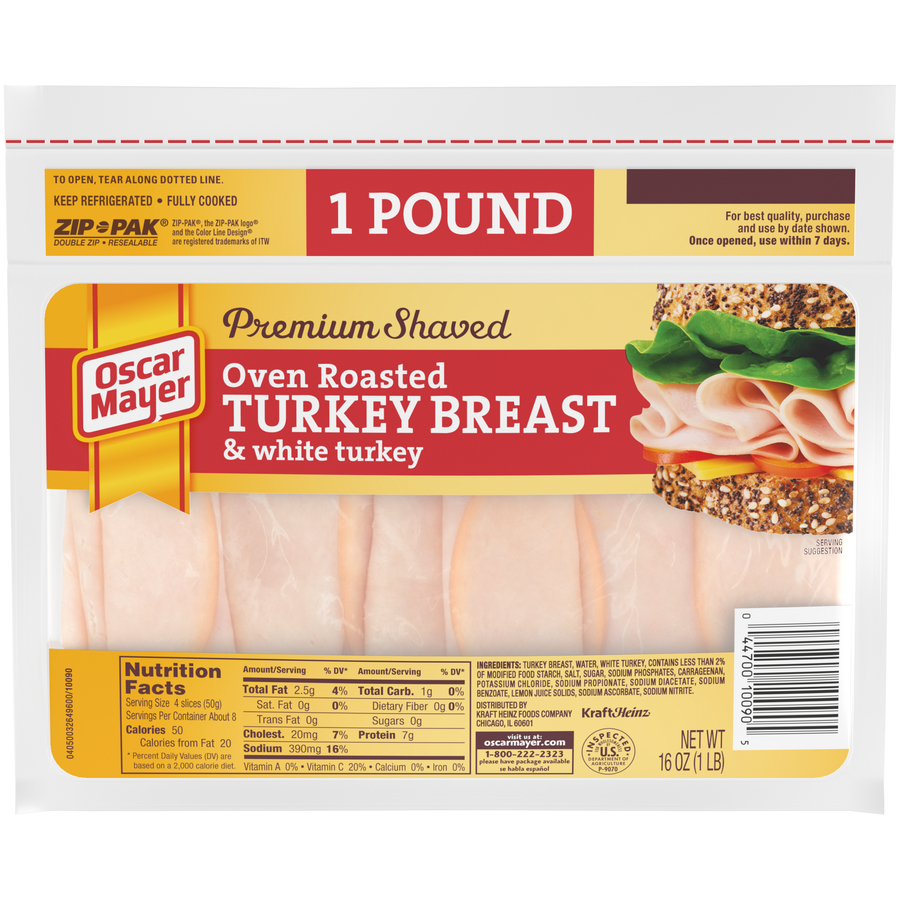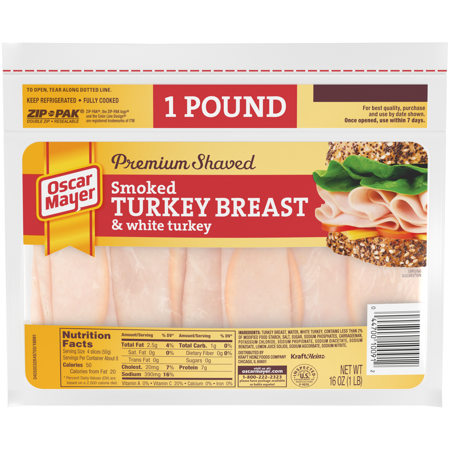 Oscar Mayer Premium Shaved Smoked Turkey Breast 16 Oz "Per Four Slices: 50 Calories, 2.5g Total Fat, 20mg Cholesterol, 390mg Sodium, 1g Total Carb, 7g Protein" ![]() |