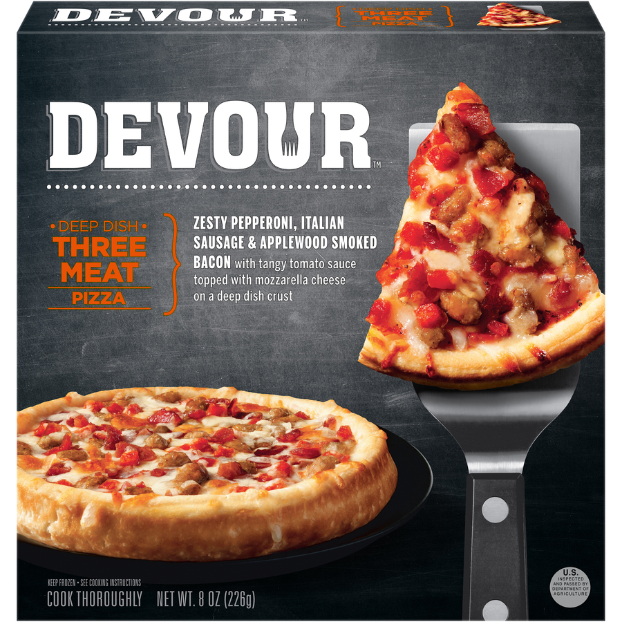 Devour Deep Dish Three Meat Pizza 8 Oz Per Pizza: 660 Calories, 16g Sat Fat, 1140mg Sodium, 6g Sugars, 23g Protein & Calcium ![]() |