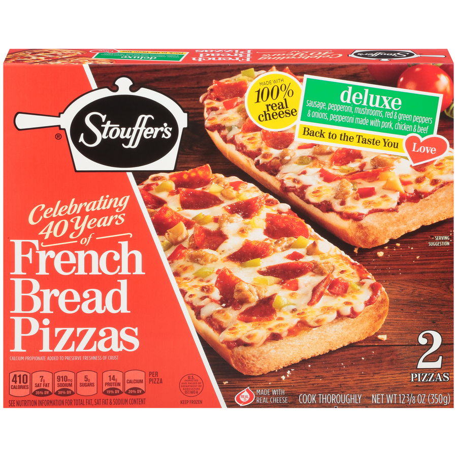 Stouffer's French Bread Deluxe Pizzas (2) 12.37 Oz Per Pizza: 410 Calories, 7g Sat Fat, 910mg Sodium, 5g Total Sugars, 14g Protein & Calcium ![]() |