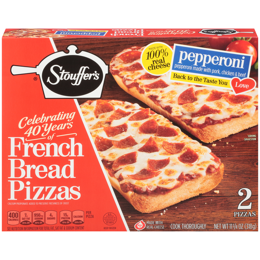 Stouffer's French Bread Pepperoni (2) 11.25 Oz Per Pizza: 400 Calories, 7g Sat Fat, 950mg Sodium, 4g Total Sugars, 15g Protein & Calcium ![]() |