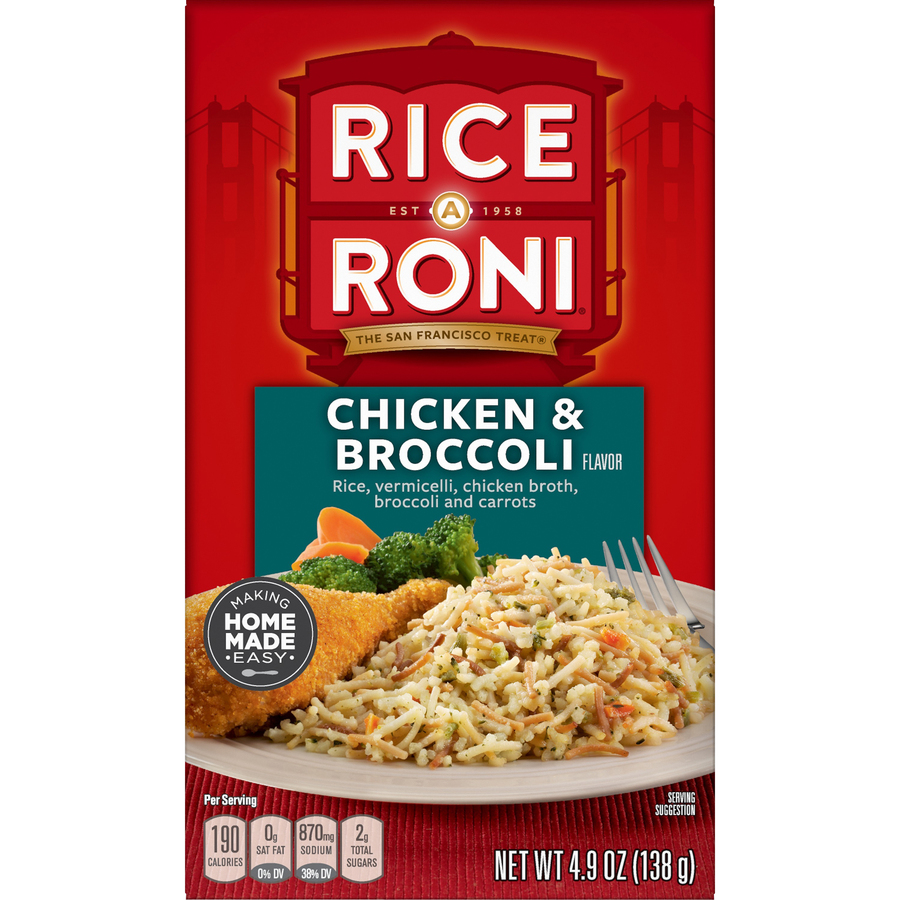 Chicken & Broccoli Flavored Rice 4.9 Oz "Per 2 Oz Serving: 230 Calories, 5g Total Fat, 0mg Cholesterol, 920 Sodium, 41g Total Carb, 6g Protein" ![]() |