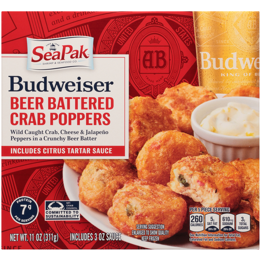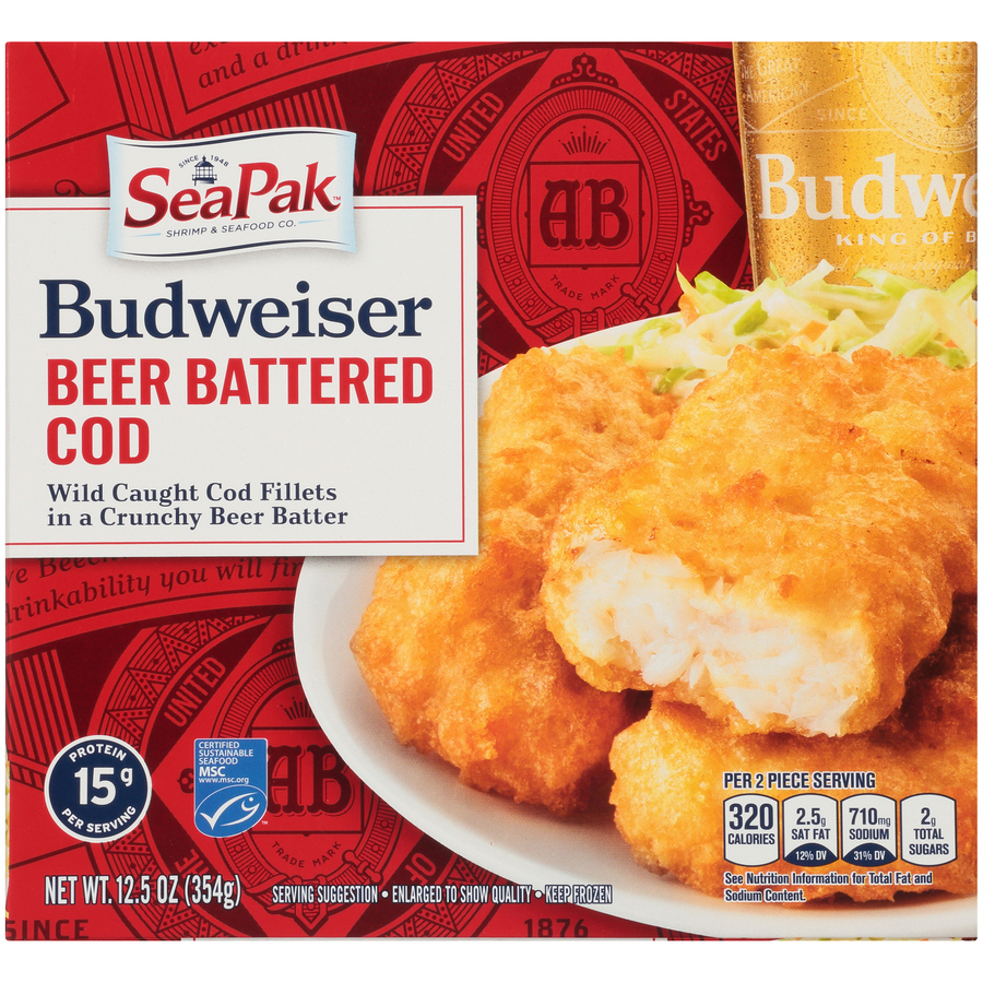 From the beverage king Budweiser® comes a nice beer batter flavor for Sea Pak's cod, crab poppers, calamari, jumbo & regular shrimp! Extra beer on the side not (ahem) required ;) Well, ok, if you want!