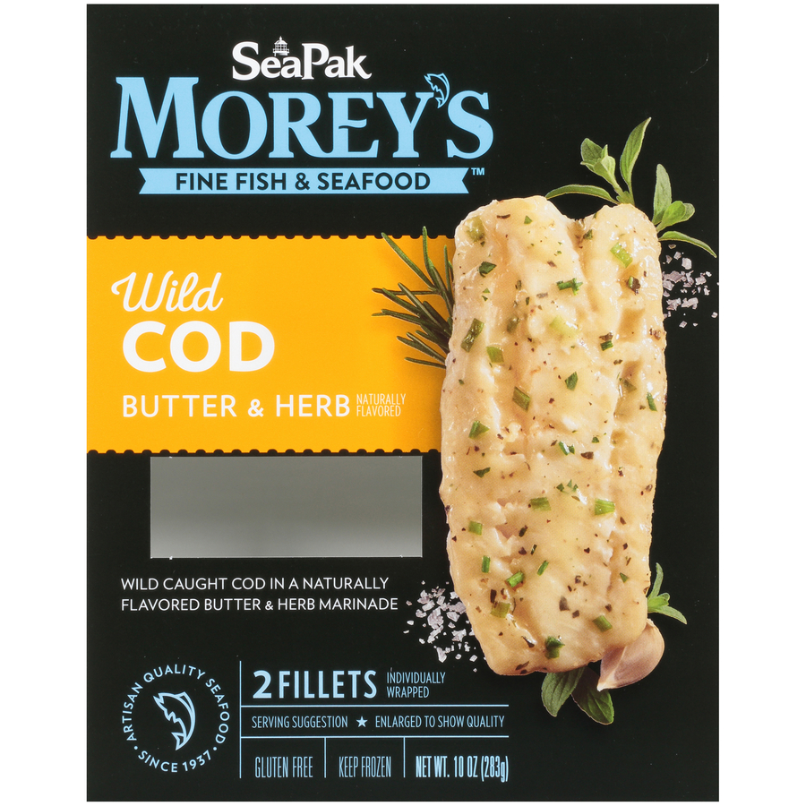 Sea Pak Butter & Herb Wild Cod Fillets, Two 10 Oz "One Fillet: 210 Calories, 13g Total Fat, 40mg Cholesterol, 440mg Sodium, 3g Total Carbohydrate, 21g Protein" ![]() |