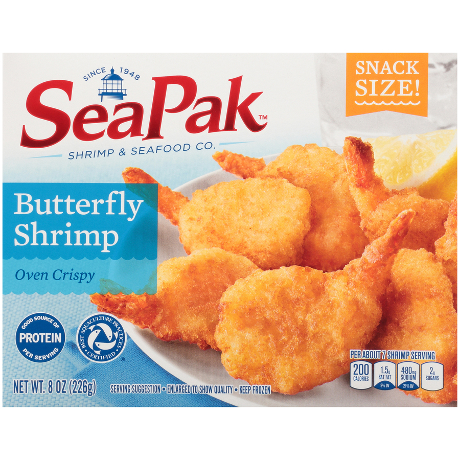 Sea Pak Oven Crispy Butterfly Shrimp 8 Oz "Per Seven Shrimp: 200 Calories, 11g Total Fat, 30mg Cholesterol, 480mg Sodium, 20g Total Carbohydrate, 7g Protein" ![]() |