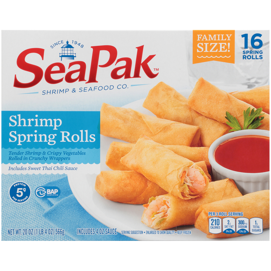 Sea Pak Shrimp Spring Rolls 16 Each 20 Oz "Per Three Rolls: 210 Calories, 11g Total Fat, 15mg Cholesterol, 300mg Sodium, 22g Total Carbohydrate, 5g Protein" ![]() |