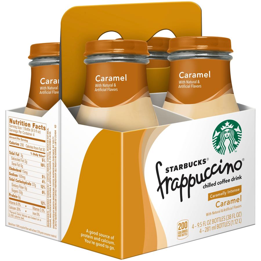 Chilled Caramel Frappuccino Four Pack 9.5 FL Oz Each "Per One Bottle: 200 Calories, 3g Total Fat, 15mg Cholesterol, 100mg Sodium, 37g Total Carb, 6g Protein" ![]() |