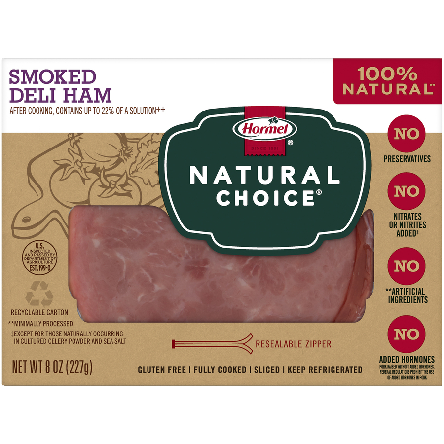 Hormel Natural Choice Smoked Deli Ham 8 Oz "Per 4 Slices: 60 Calories, 1.5g Total Fat, 30mg Cholesterol, 520 Sodium, 1g Total Carbs, 10g Protein" ![]() |