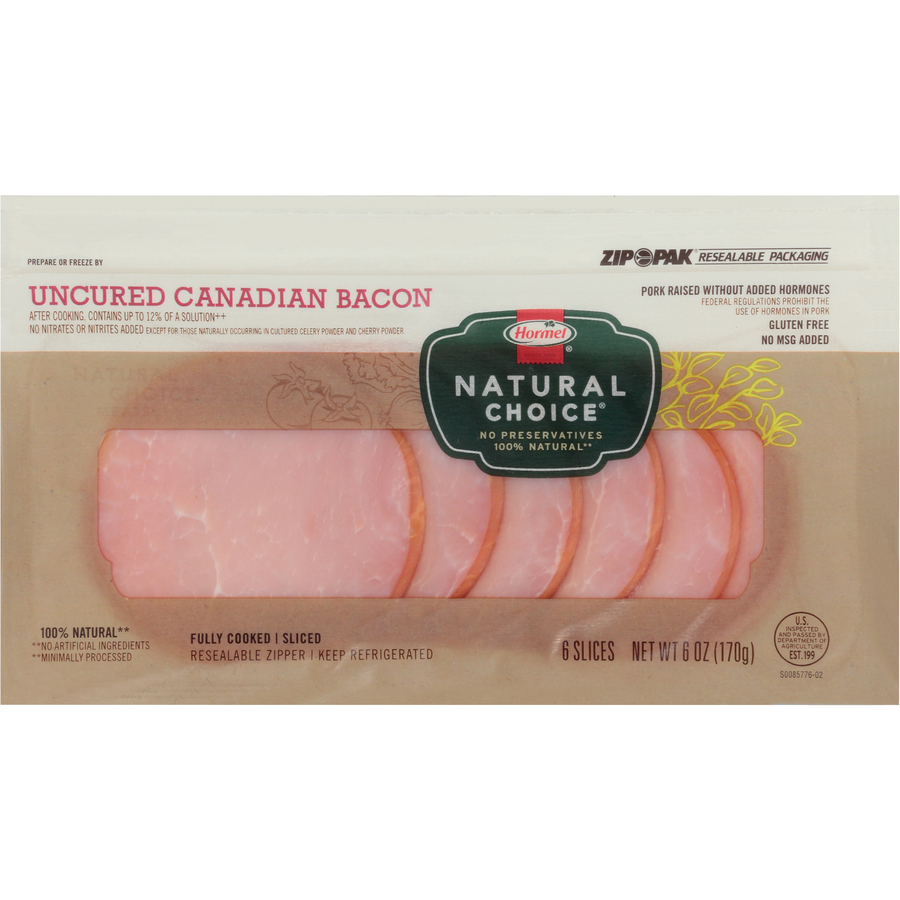 Natural Choice Uncured Canadian Bacon 6 Slices 6 Oz "Per 2 Slices: 70 Calories, 2g Total Fat, 30mg Cholesterol, 620 Sodium, 1g Total Carbs, 11g Protein" ![]() |